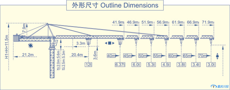 SCM-C7030(12t)塔式起重机最大起重量12t,各种机构采用本公司先进技术,性能优越,构造合理,就位准确。该机具有轨道行走式、固定附着式和内爬式三种使用类型。